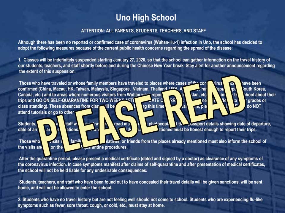 Uno High School ATTENTION: ALL PARENTS, STUDENTS, TEACHERS, AND STAFF Although there has been no reported or confirmed case of coronavirus (Wuhan-Hu-1) infection in Uno, the school has decided to adopt the following measures because of the current public health concerns regarding the spread of the disease: 1. Classes will be indefinitely suspended starting January […]
