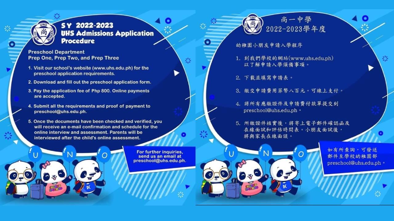 Good day, Parents and Guardians! The Uno High School Preschool Department is now accepting applications for new students in Prep One, Prep Two, and Prep Three for SY 2022-2023. You may visit this link: https://uhs.edu.ph/preschool-application-requirements/ for the preschool application requirements. For inquiries, you may send an email to preschool@uhs.edu.ph. Please note that the Prep One […]